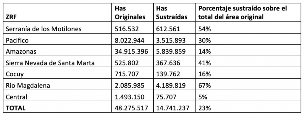 En Colombia, la sustracción de ZRF se ha dado de la siguiente forma: